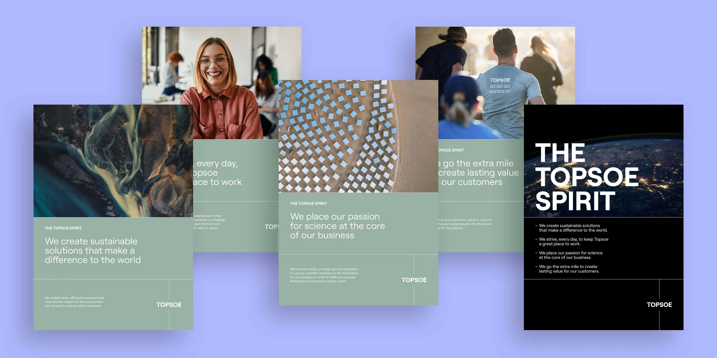 Topsoe arbejder med at perfektionere kemi for at opnå en bedre verden. Essensen samarbejder med TOPSOE om at brede deres stærke nye CVI ud på en række kontaktpunkter, så der skabes sammenhæng og kvalitet i det visuelle udtryk